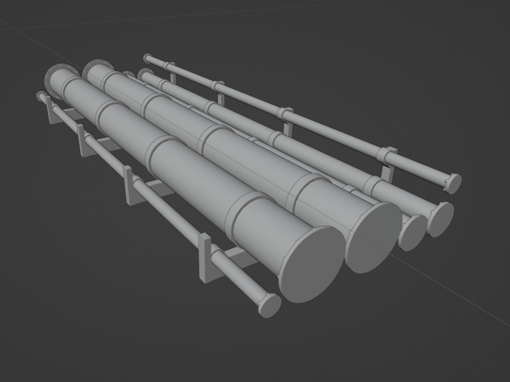 All pipes are made using Bezier curves, with bevel depths set to 1.5, 0.7 and 0.4. A standard straight section is 40 mm long, but other sections vary as the situation requires.